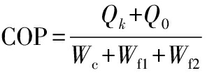 式中:Qk,热泵冷凝器制热量,kW;Q0,热泵蒸发器制冷量,kW;Wc,压缩机功耗,kW;Wf1,循环风机功耗,kW;Wf2,辅助冷凝器风机功耗,kW。