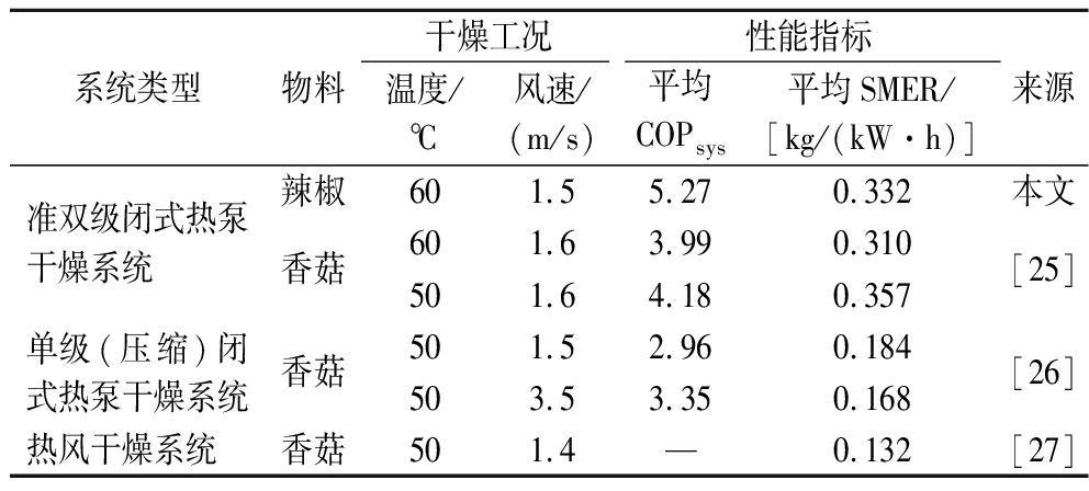 本文所用系统也曾应用于香菇的干燥工艺,与香菇相比,辣椒的干燥能耗指标均略优于香菇。表1分别对比了准双级闭式热泵干燥系统、单级(压缩)闭式热泵干燥系统和热风干燥系统的性能指标。可以看出,当干燥物料均为香菇时,准双级闭式热泵干燥系统的平均COPsys较单级闭式热泵干燥系统提升了41.2%;而平均SMER较单级(压缩)闭式热泵干燥系统提升了94%,与热风干燥系统相比提升了170%。因此,准双级闭式热泵干燥系统能耗明显优于单级(压缩)闭式热泵干燥系统和热风干燥系统。