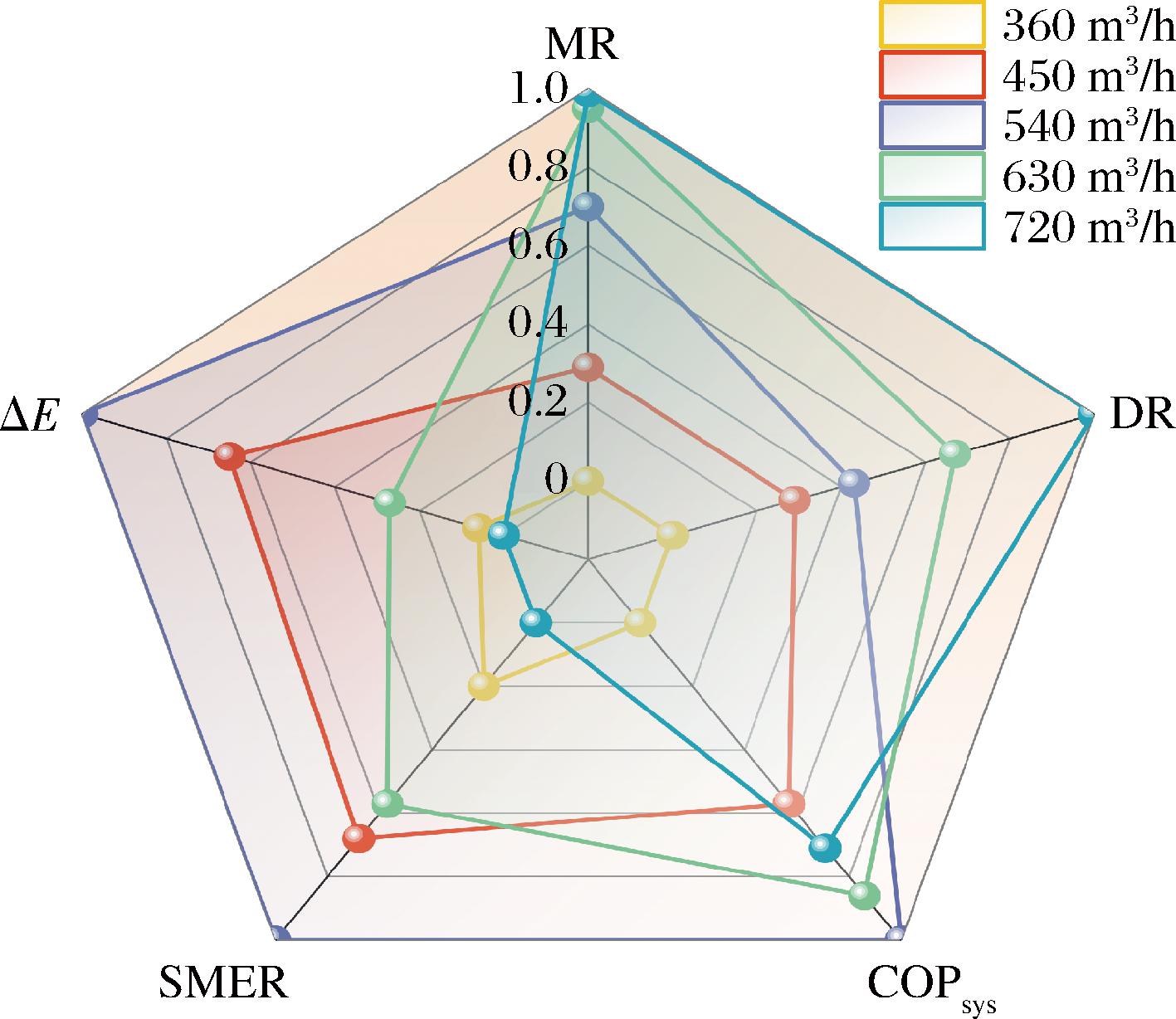 图8使用归一化数据处理法做出不同循环风量对辣椒干燥特性及热泵系统性能影响指标的雷达图。图中的曲线填充区域越大,代表该项指标越优异。当循环风量为540 m3/h时,SMER、COPsys和色差最优;当循环风量为720 m3/h 时,水分比和干燥速率最优。根据综合能耗、干燥效率与品质的平衡,本文最终选择540 m3/h作为辣椒热泵干燥的最优循环风量。