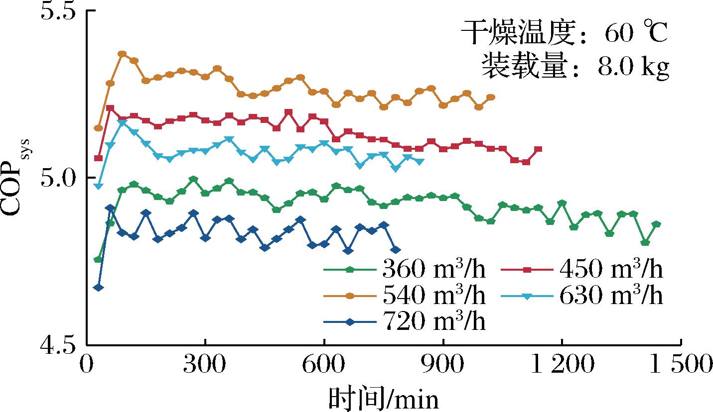 图5展示了不同循环风量下COPsys随时间的变化曲线。COPsys总体呈现先上升后波动下降的趋势,当循环风量为360 m3/h时,COPsys的最大值出现在干燥的第270 min;当循环风量为540、630 m3/h时,COPsys的最大值出现在干燥的第90 min;而当循环风量为450、720 m3/h时,COPsys的最大值出现在干燥的第60 min。曲线波动的原因在于系统通过比例、积分、微分(proportion、integral、differential,PID)控制系统自动调节压缩机转速,以使干燥室温度稳定在设定值附近,导致系统功耗发生变化。在干燥初期阶段,系统需要一定时间逐渐适应并达到最佳运行状态,这导致COPsys呈现上升趋势。对于高循环风量(720 m3/h),由于更高的风量可以更快地带走湿气,系统能在较短的时间内达到最佳性能,因此COPsys的最大值出现在干燥的第60 min。然而,随着干燥过程的进行,辣椒水分迁移速度逐渐变慢,会造成COPsys的下降。从图中还可以观察到,当循环风量分别为360、450、540、630、720 m3/h时,平均COPsys分别为4.92、5.13、5.27、5.08、4.83。随着循环风量的增大,平均COPsys先增大后减小,这是因为较大的循环风量通常可以带走更多的水分,加速干燥过程,从而提高系统的能效比。然而,过大的循环风量可能会让压缩机(增加了压缩机转速)和风机的功耗进一步增大,使COPsys下降。因此,从COPsys的角度来看,选择540 m3/h作为最优循环风量。