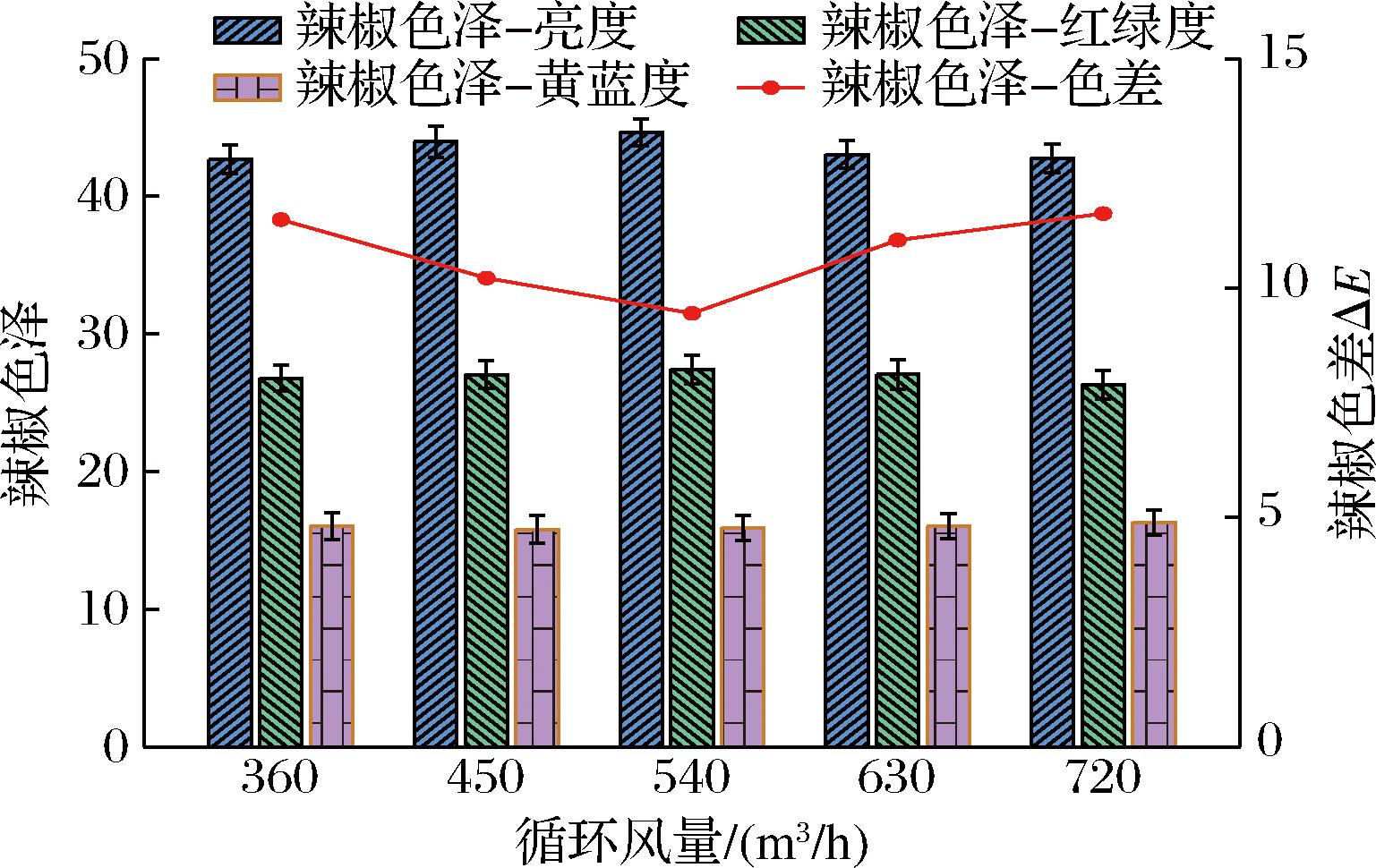 图7显示了不同循环风量下辣椒干后色泽的情况。随着循环风量的增加,亮度L*和红绿度a*先上升后下降,其最大值出现在540 m3/h时;黄蓝度b*先下降后上升,其最小值出现在450 m3/h时;而色差ΔE则是先下降后上升,其最优值出现在540 m3/h时。这可能是由于在较低的循环风量下,空气流动不足以有效地将水分从辣椒表面带走,导致辣椒表面的水分停留,对辣椒色泽造成了影响。随着循环风量的增加,辣椒表面的水分更容易被带走,使得辣椒的亮度和红度上升,黄度增加,色差也随之增加。然而,过高的循环风量可能会导致辣椒表面水分蒸发过快,从而导致色素的破坏,使得色泽参数均较差,降低了干后辣椒的品质。由测量和计算得出当循环风量分别为360、450、540、630、720 m3/h时,色差分别为11.49、10.22、9.45、11.05、11.63。因此,从干辣椒色泽的角度来看,选择540 m3/h作为最优循环风量。