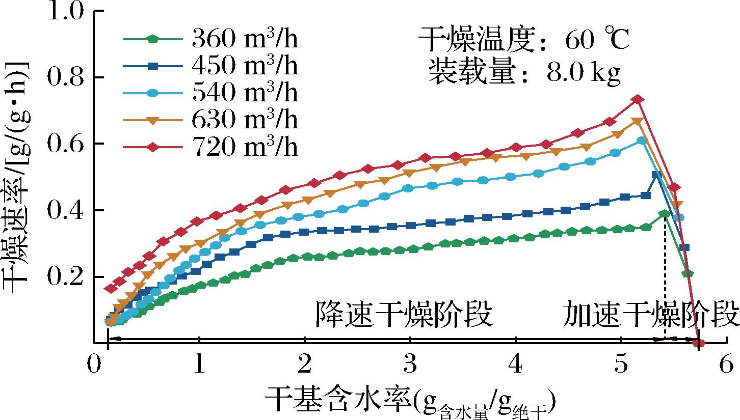 注:横坐标表示干基含水率。由于干燥过程中含水率随时间推移而降低,故干燥过程沿横坐标由右向左进行;图中相邻数据点从起点开始对应的时间间隔为 30 min。