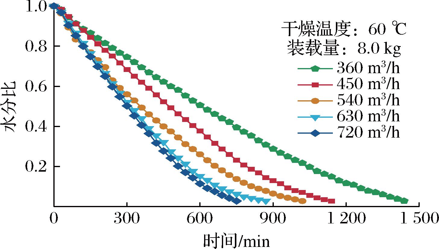 Fig.3 Variation of moisture ratio of chilli peppers with time under different circulating air volume