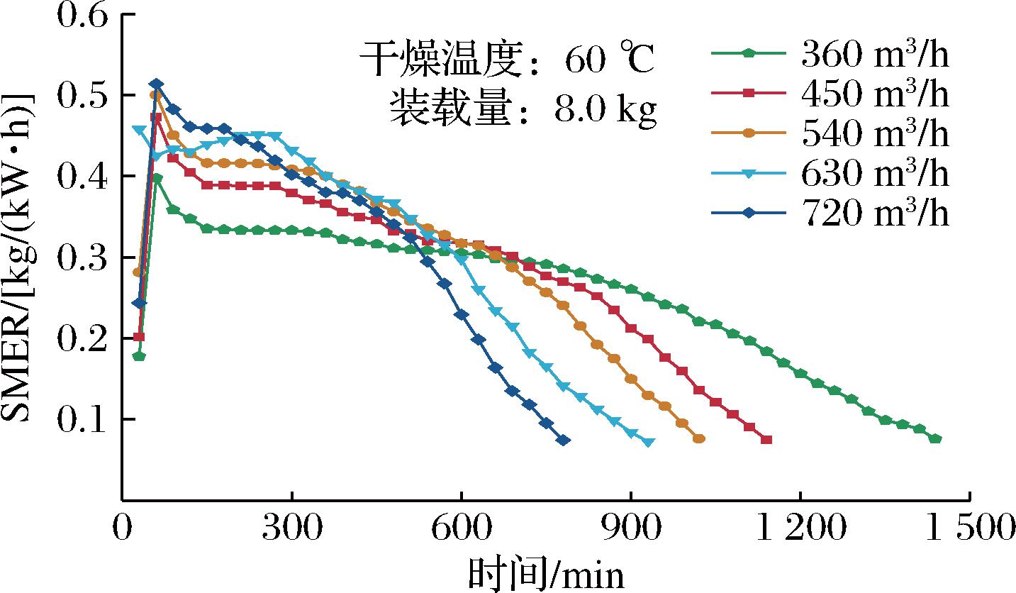 Fig.6 Variation of SMER with time for different circulating air volumes