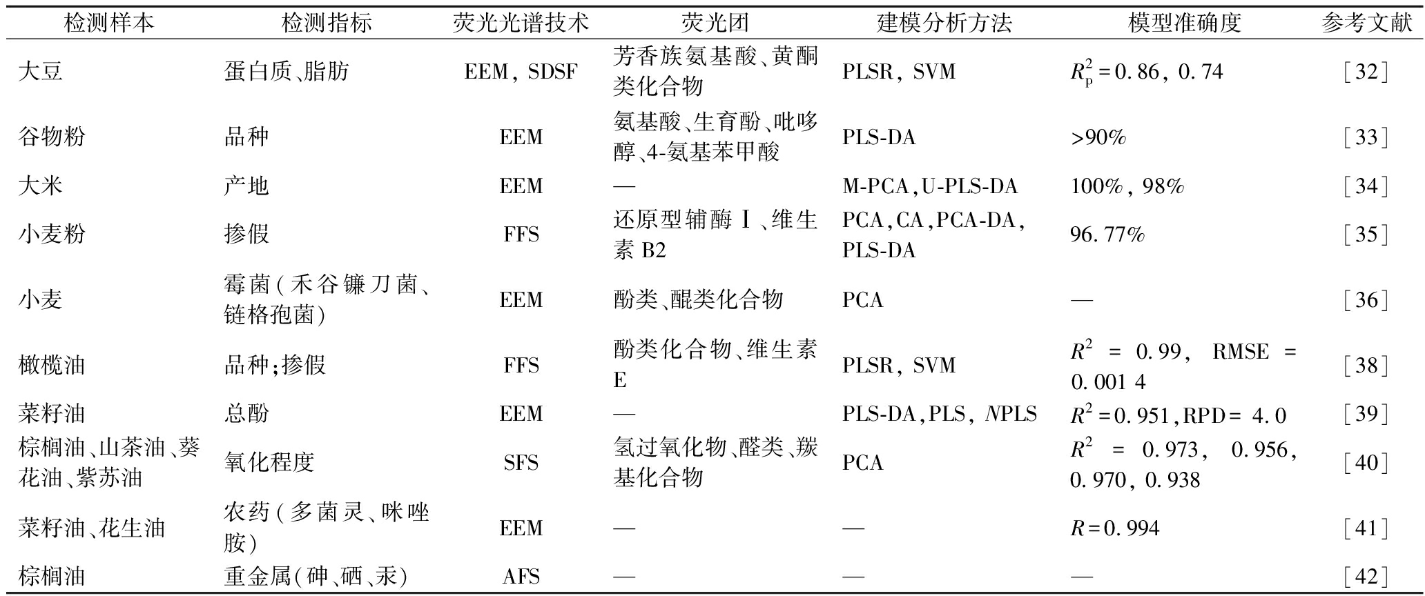 FS技术在油脂检测方面的应用主要包括对脂肪酸、总生育酚、维生素等物质的含量进行定量预测,通过评估油脂的过氧化值、酸值来反应其新鲜度和氧化特性。同时在检测黄曲霉毒素,多菌灵、咪唑胺、百菌清等农药,砷、硒和汞等重金属及多环芳烃等有害物中有广泛的应用,以保障油脂的品质安全。基于在特定发射波长下不同物质的荧光峰变化,对食用油实现品种分类,掺假现象鉴别[37]。表3中总结了该技术在粮油检测方面的具体应用。