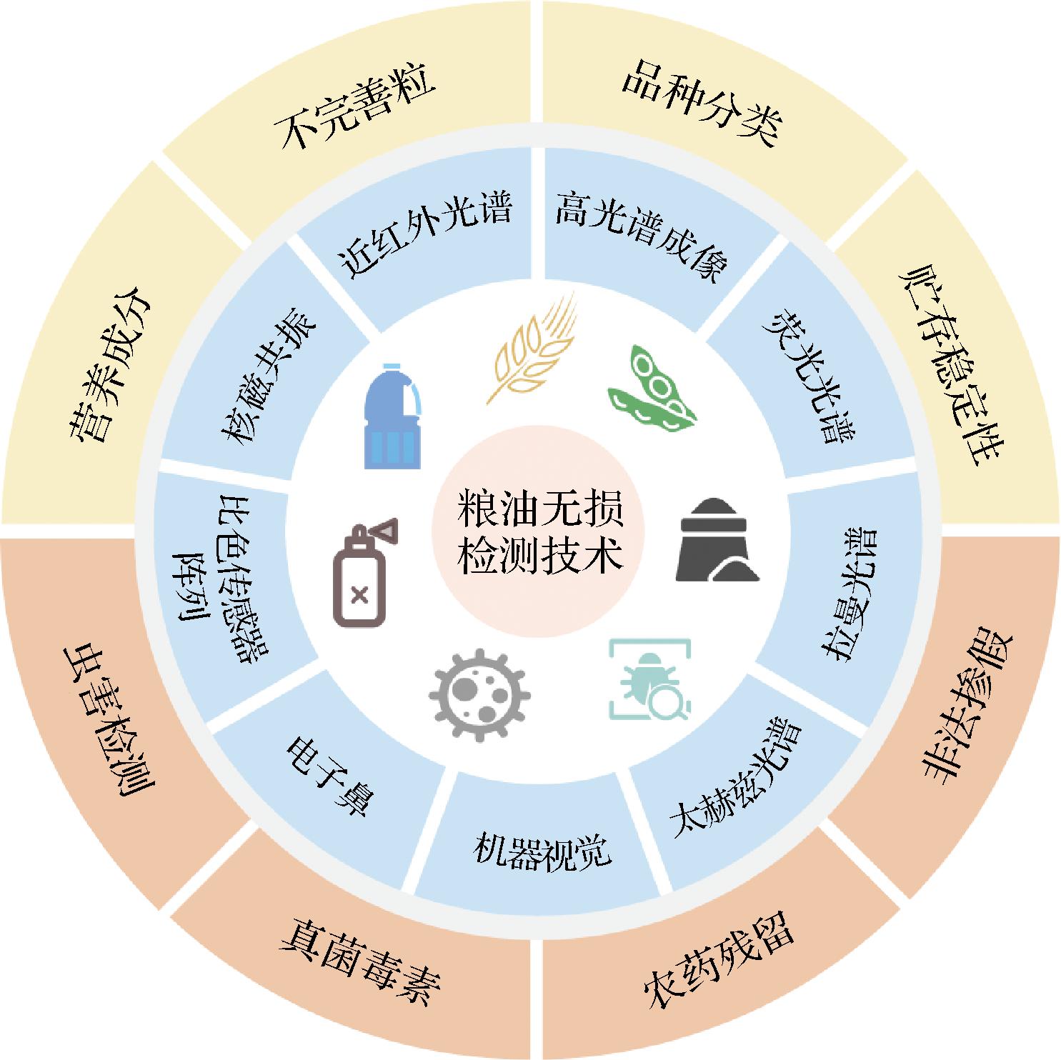 Fig.1 Main applications of nondestructive testing technologies in grain and oil quality and safety detection
