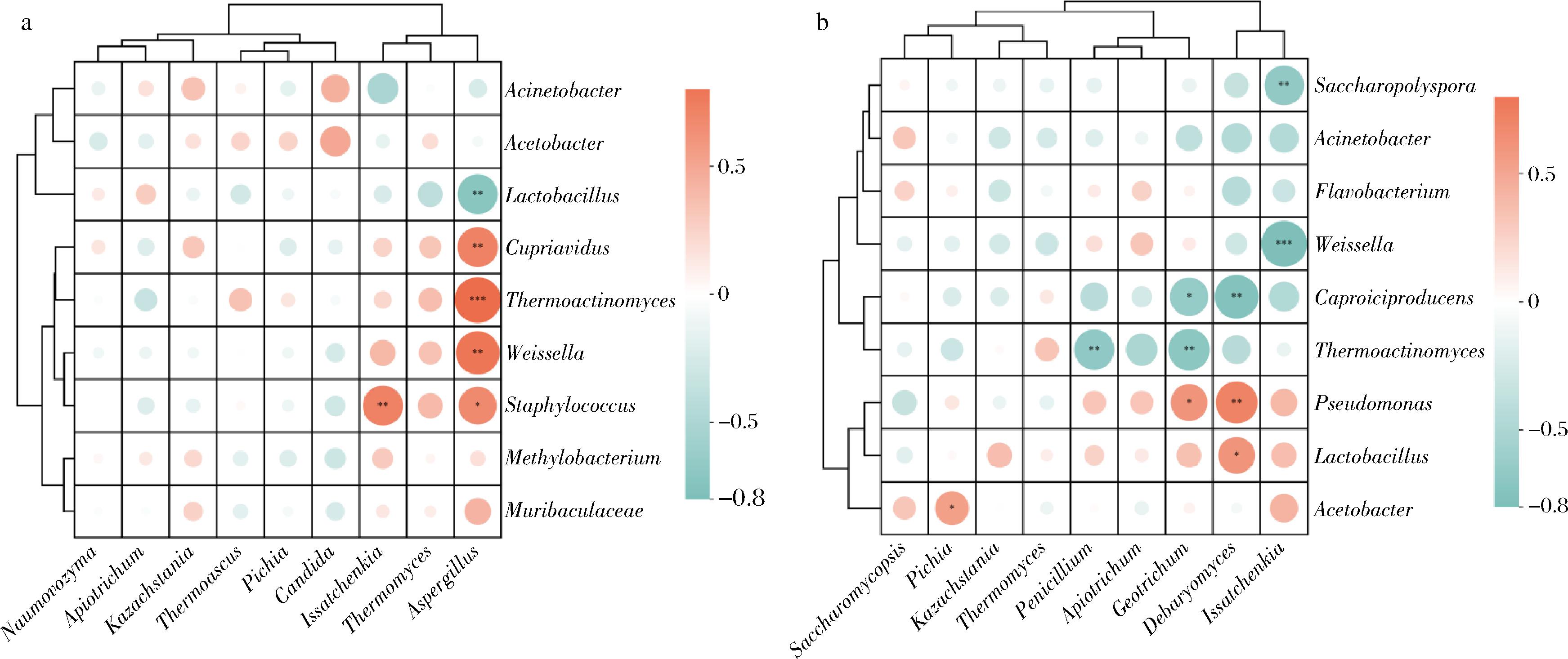微生物多样性及演替决定其复杂的相互作用关系和多样化的代谢规律,本文基于Spearman相关性热图分析评估新、老窖池中优势微生物属间的相互作用关系(图12),多数优势微生物表现出较强的属间作用关系,维持微生物之间的演替和代谢平衡,驱动整个发酵过程[27]。新窖池优势真菌与细菌之间的正相关较强,老窖池反之,其中微生物相互作用呈正相关的结果表明发酵过程中具有明显的协同作用,反之呈负相关的结果具有明显的抑制作用[28]。由图12-a可知,新窖糟醅发酵过程中,曲霉属(Aspergillus)与高温放线菌属(Thermoactinomyces)呈高度显著正相关(P<0.001),与贪铜菌属(Cupriavidus)、魏斯氏菌属(Weissella)呈极显著正相关(P<0.01),与葡萄球菌属(Staphylococcus)呈显著正相关(P<0.05),与乳杆菌属(Lactobacillus)呈极显著负相关(P<0.01),研究表明曲霉属、高温放线菌属与魏斯氏菌属是新窖池中的主要优势菌属,共同推进发酵环境微生物群的组装,而乳杆菌属在演替过程中具有较强的竞争力,在整个发酵过程中占据主要地位。由图12-b可知,老窖糟醅发酵过程中微生物相互作用更加复杂,东方伊萨酵母属(Issatchenkia)和魏斯氏菌属呈高度显著负相关(P<0.001),与扣囊覆膜酵母属(Saccharomycopsis)呈显著负相关(P<0.05);德巴利酵母属(Debaryomyces)与假单胞菌属(Pseudomonas)呈极显著正相关(P<0.01),与乳杆菌属呈显著正相关(P<0.05),与己酸菌属(Caproiciproducens)呈极显著负相关(P<0.01);地霉属(Geotrichum)与假单胞菌属呈显著正相关(P<0.05),与高温放线菌属呈显著极负相关(P<0.01),与己酸菌属(Caproiciproducens)呈显著负相关(P<0.05);青霉菌属(Penicillium)与高温放线菌属呈显著极负相关(P<0.01);毕赤酵母属(Pichia)与醋酸菌属(Acetobacter)呈显著正相关(P<0.05),与邱显平等[29]研究结果相近,老窖池组的微生物网络具有更高的聚集程度,微生物群落的共存关系更加复杂。综上,新、老窖微生物群在窖池环境长时间的筛选下逐渐稳定,但新窖内的微生物相关性在老窖中不尽相同,与窖龄息息相关。