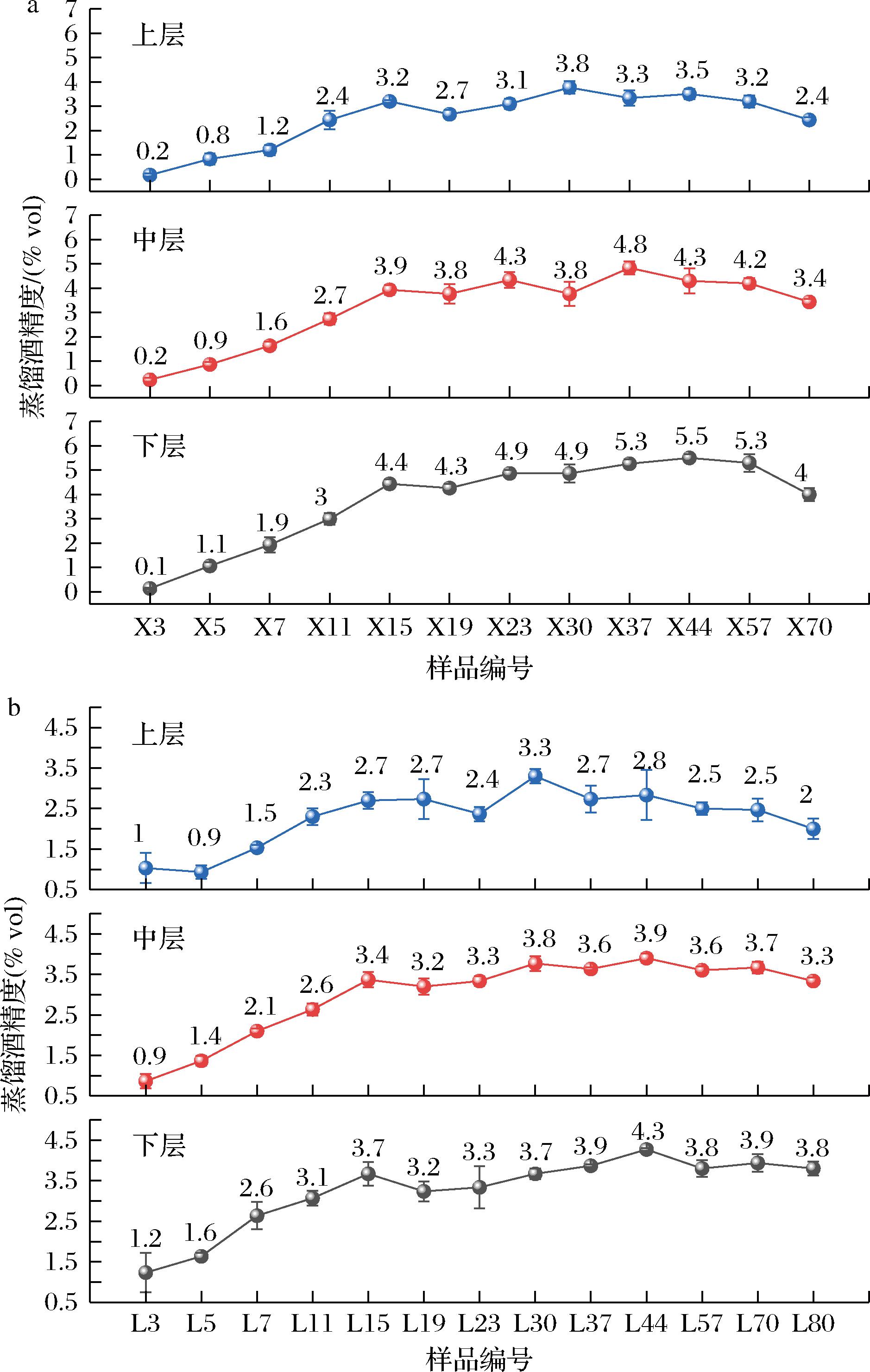 糟醅蒸馏酒精度主要反映糟醅发酵过程中酒精含量变化规律,新窖糟醅蒸馏酒精度从0.2%vol升高至2.4%vol~4%vol,老窖糟醅蒸馏酒精度从0.9%vol~1.2%vol升高至2%vol~3.8%vol(图6),新窖糟醅蒸馏酒精度在发酵前期上升幅度高于老窖,发酵中后期变化规律相近,这与窖池发酵前期大量生成酒精、发酵中后期醇酸酯化反应能力相关。由于重力的作用,下层糟醅酒精含量较中、上层丰富,其次下层糟醅蒸馏酒精度高于中、上层是由于蒸馏过程中收集到其他挥发性物质导致[19]。