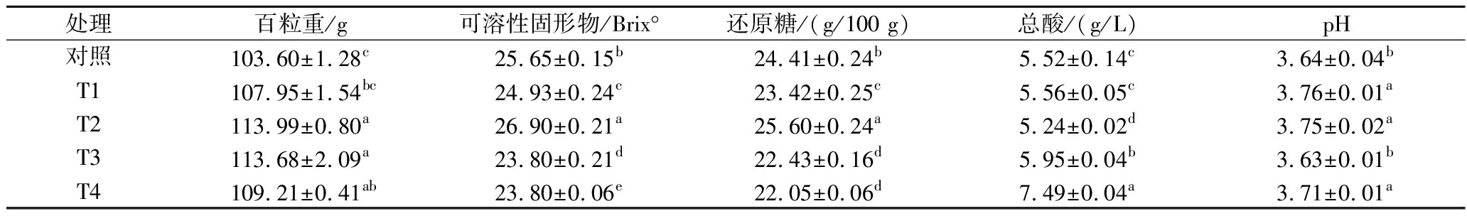 处理百粒重/g可溶性固形物/Brix°还原糖/(g/100 g)总酸/(g/L)pH对照103.60±1.28c25.65±0.15b24.41±0.24b5.52±0.14c3.64±0.04bT1107.95±1.54bc24.93±0.24c23.42±0.25c5.56±0.05c3.76±0.01aT2113.99±0.80a26.90±0.21a25.60±0.24a5.24±0.02d3.75±0.02aT3113.68±2.09a23.80±0.21d22.43±0.16d5.95±0.04b3.63±0.01bT4109.21±0.41ab23.80±0.06e22.05±0.06d7.49±0.04a3.71±0.01a