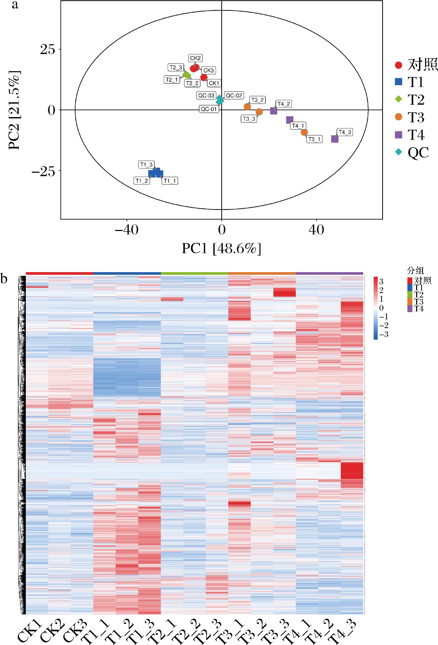 主成分分析是一种将多个相关变量转化为一组线性不相关变量的统计方法。通过对不同负载量葡萄代谢物进行主成分分析(图4-a),结果表明所有样本均位于95%置信区间内。其中,第一主成分(PC1)能够解释数据集48.6%的总变异性,而第二主成分(PC2)解释了21.5%的变异性。因此,前2个主成分解释了数据集总变异性的70.1%,说明对照、T1、T2、T3和T4处理组之间的代谢物表现出显著的差异性。与主成分分析不同,聚类热图能够直观地展示不同负载量葡萄中代谢物表达量的聚类关系。如图4-b所示的树形图中,可以清晰地观察到,与对照组相比,T1、T2、T3和T4处理组的代谢数据呈现出明显的分离趋势,且存在显著差异。