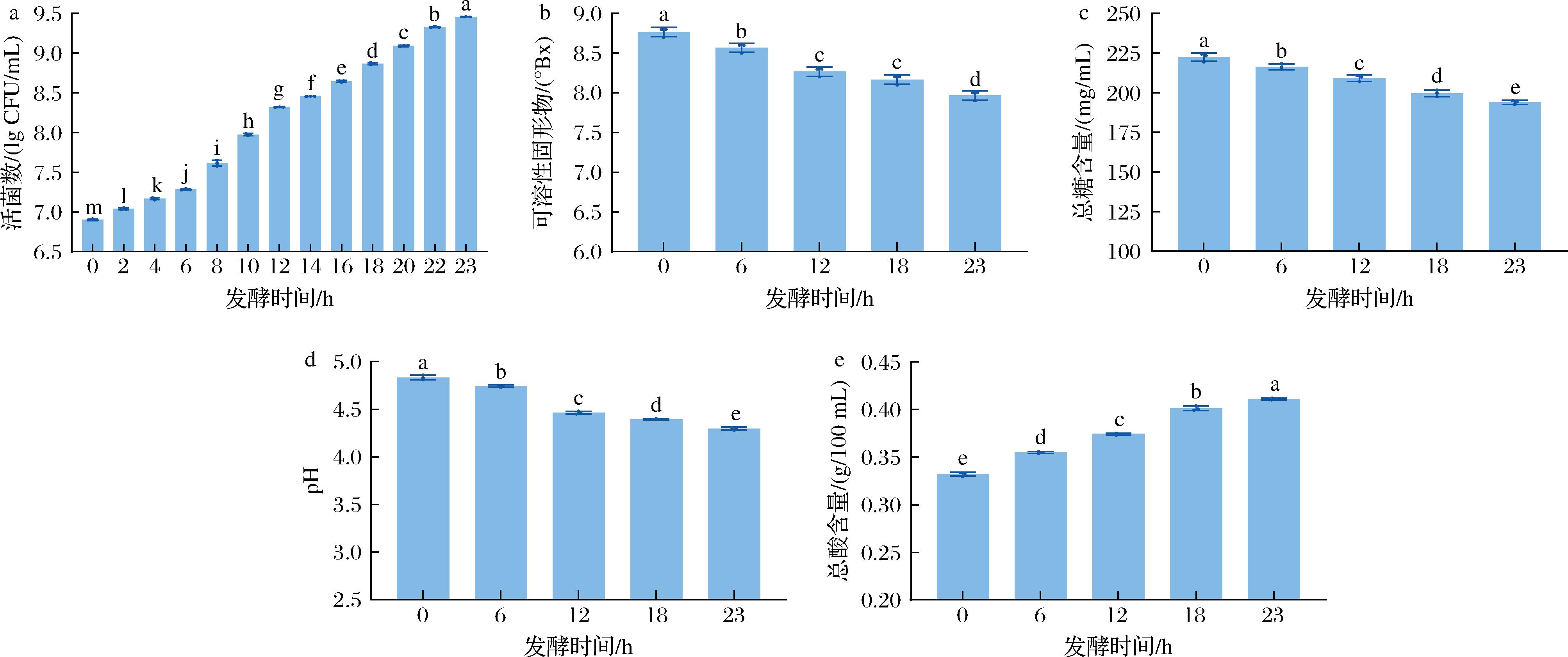 a-活菌数;b-可溶性固形物;c-总糖含量;d-pH;e-总酸含量
