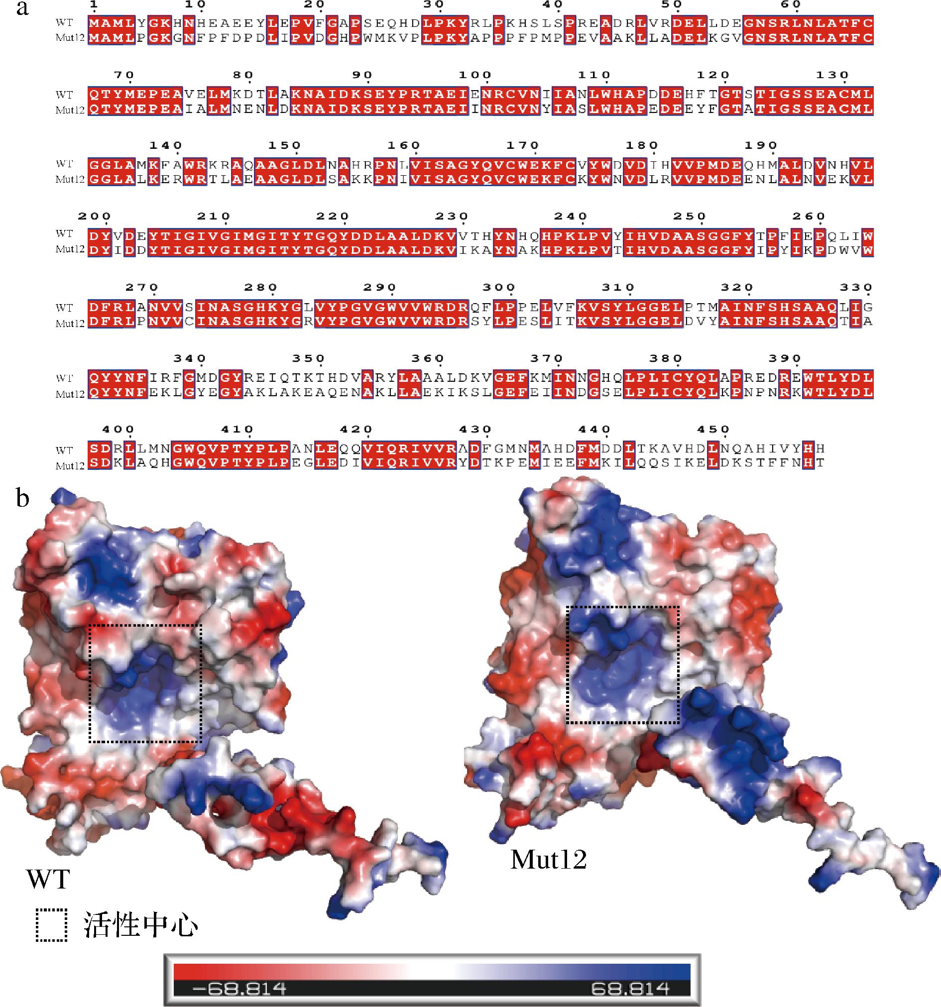 Fig.3 Sequence alignment and electrostatic surface analysis of WT and Mut12