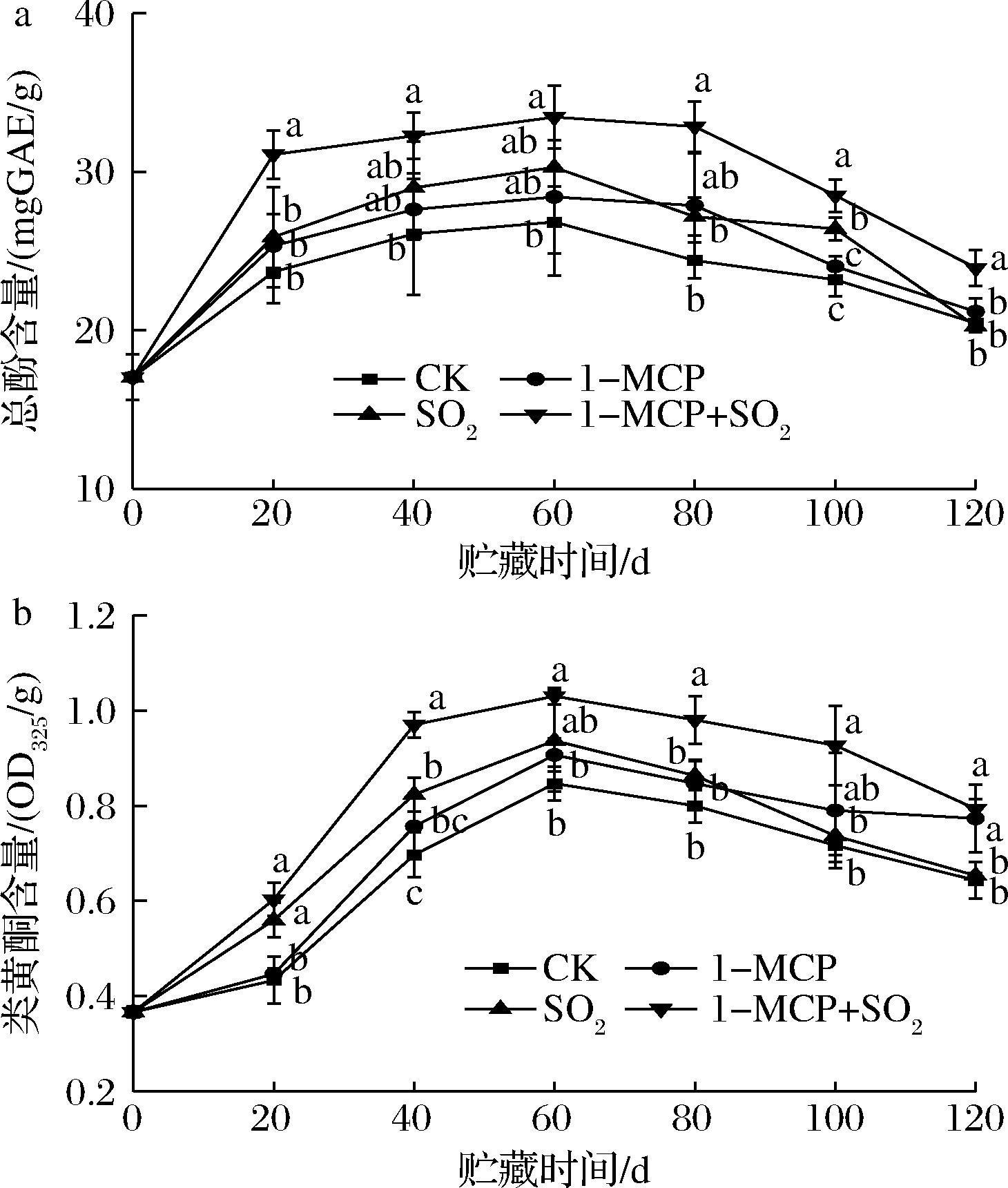 从整体看,随着贮藏时间的延长,西梅果实总酚和类黄酮含量变化整体呈现先升高后降低的趋势。如图7-a所示,贮藏0~60 d时,总酚含量随着贮藏期的延长呈现上升趋势,其中1-MCP、SO2熏蒸组、1-MCP结合SO2熏蒸组在贮藏60 d时,含量分别可达28.41、30.28、33.45 mg/g,分别是对照组的1.06、1.12、1.17倍。说明1-MCP及SO2熏蒸均能够促进总酚含量的积累,抑制其分解,且二者结合效果最佳。