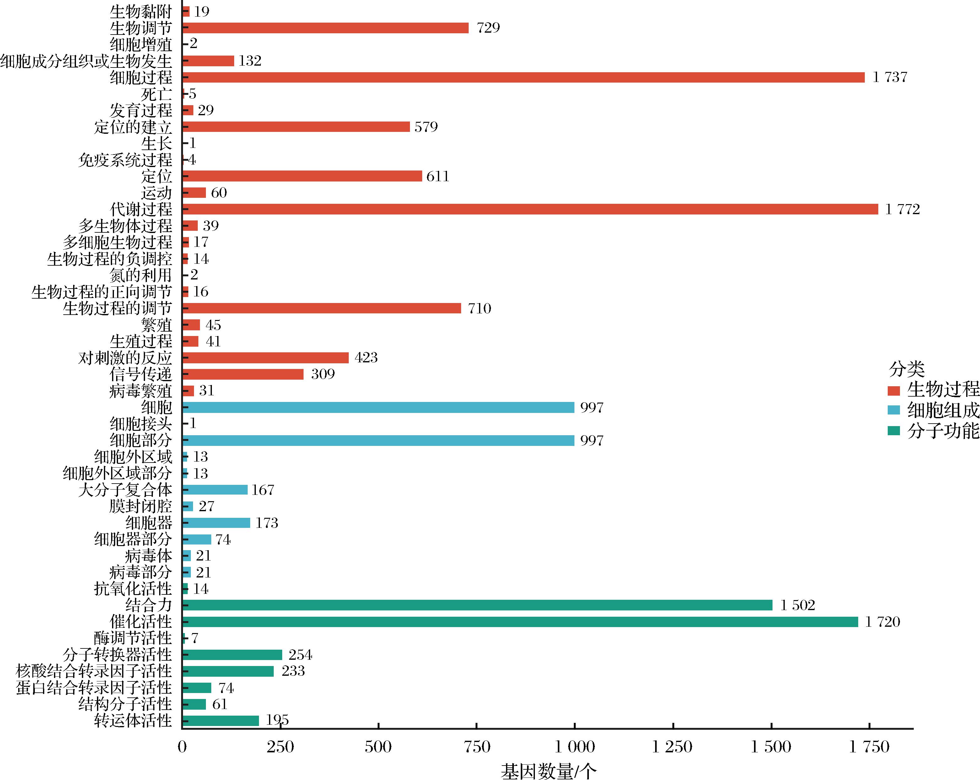 采用IPRscan软件将Massilia puerhi SJY3T的基因组编码基因序列与GO数据库进行比对注释,结果如图2所示。注释结果表明,共有3 382个基因获得了GO注释,占总编码基因数量(5 220个)的64.79%。在GO的3个主要功能类别中,与细胞组成相关的基因数量为2 504个,与生物过程相关的基因为7 327个,与分子功能相关的基因为4 060个(由于GO分类体系中一个基因可同时注释至多个功能条目,因此总数可能超过实际基因数目)。在3个大类中,进一步可细分为44个二级功能类别。在生物过程大类的24个二级类别中,代谢过程和细胞过程占比最高,分别有1 772、1 737个基因;此外,被注释到生物调节、生物过程调控、定位、定位活性、刺激反应、信号传导、细胞组织部分或生物合成的基因数量也比较多。在细胞组分大类的11个二级分类中,细胞和细胞部分占比最高,均有997个基因,其次是细胞器、高分子复合物、细胞器部分。而在分子功能大类中有9个二级分类,占比最高的是催化活性,有1 720个基因,其次是结合活性和分子转导活性、核酸结合转录因子活性。基于GO功能注释结果推测,Massilia puerhi SJY3T可能在普洱茶窖藏发酵过程中具有一定的有机物降解能力。多个被注释为氧化还原酶(GO:0016491)、甲基转移酶(GO:0008168)和酯酶(GO:0016788)的基因,可能在茶叶成分的生化转化中发挥作用。有研究表明,氧化还原酶可参与木质纤维素的降解过程,促进复杂有机物的分解[12]。罗芳[13]研究发现,水稻中的甲基转移酶基因在应对除草剂阿特拉津胁迫时被诱导表达,参与了对该化合物的降解。此外,刘艳艳等[14]从土壤宏基因组中克隆获得一种新型酯酶基因est924,发现其产物可降解多种邻苯二甲酸酯类环境污染物,提示微生物源酯酶在环境污染治理中的潜在应用价值。综上,GO注释结果不仅揭示了Massilia puerhi SJY3T的主要功能特征,也为进一步探索其在生态系统碳循环、污染降解和食品发酵等方面的潜在功能提供了基础信息。