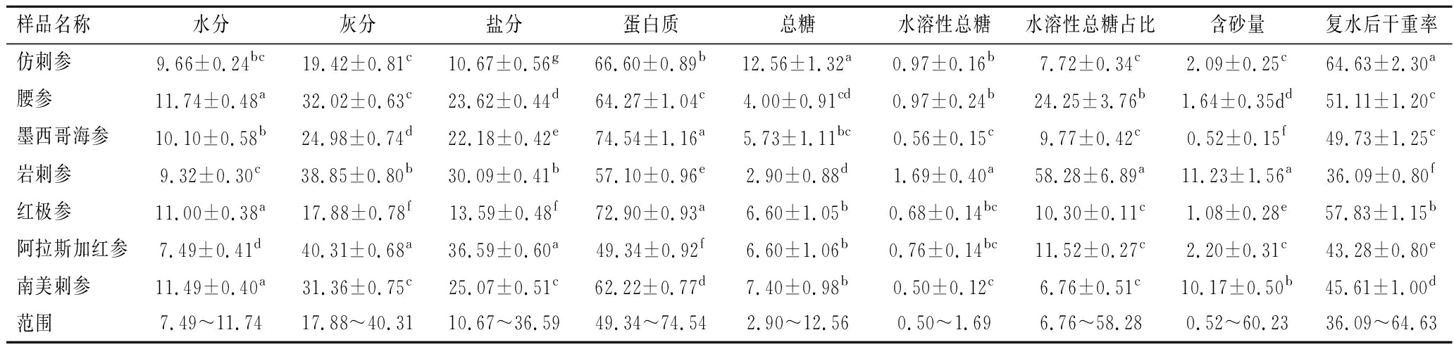 样品名称水分灰分盐分蛋白质总糖水溶性总糖水溶性总糖占比含砂量复水后干重率仿刺参9.66±0.24bc19.42±0.81c10.67±0.56g66.60±0.89b12.56±1.32a0.97±0.16b7.72±0.34c2.09±0.25c64.63±2.30a腰参11.74±0.48a32.02±0.63c23.62±0.44d64.27±1.04c4.00±0.91cd0.97±0.24b24.25±3.76b1.64±0.35dd51.11±1.20c墨西哥海参10.10±0.58b24.98±0.74d22.18±0.42e74.54±1.16a5.73±1.11bc0.56±0.15c9.77±0.42c0.52±0.15f49.73±1.25c岩刺参9.32±0.30c38.85±0.80b30.09±0.41b57.10±0.96e2.90±0.88d1.69±0.40a58.28±6.89a11.23±1.56a36.09±0.80f红极参11.00±0.38a17.88±0.78f13.59±0.48f72.90±0.93a6.60±1.05b0.68±0.14bc10.30±0.11c1.08±0.28e57.83±1.15b阿拉斯加红参7.49±0.41d40.31±0.68a36.59±0.60a49.34±0.92f6.60±1.06b0.76±0.14bc11.52±0.27c2.20±0.31c43.28±0.80e南美刺参11.49±0.40a31.36±0.75c25.07±0.51c62.22±0.77d7.40±0.98b0.50±0.12c6.76±0.51c10.17±0.50b45.61±1.00d范围7.49~11.7417.88~40.3110.67~36.5949.34~74.542.90~12.560.50~1.696.76~58.280.52~60.2336.09~64.63