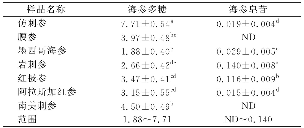 表2 海参中海参多糖及海参皂苷含量 单位:%(以干重计)