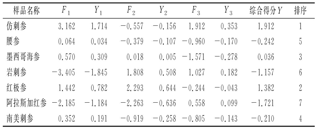 根据3个主成分特征值所对应的方差贡献率建立海参营养综合评价模型Y=0.542×F1+0.281×F2+0.177×F3,计算各种海参的综合得分,并按大小顺序加以排序。结果见表5。第1成分因子F1中可看出,仿刺参得分3.162,得分最高;同时结合表3分析,第1主成分的特征值为4.816,为三大主成分中方差贡献率最高的主成分,所占权重为54.2%。由于主成分综合得分(Y)为各主成分特征值权重与各主成分因子得分(F)的乘积,从而导致仿刺参的第1主成分综合得分为最高,得分1.714。另外,通过表4分析可知,第1主成分主要以复水后干重率的影响为主,而在表1中可发现,仿刺参的复水干重率在7种海参中也是最高的,结果证明综合主成分得分能够较客观地反映海参的营养品质。同时,海参的各主成分得分相加可获得各种海参的综合营养得分,可发现仿刺参的综合营养得分1.912,得分最高。综合营养得分显示,仿刺参、红极参及墨西哥海参综合得分均大于0,腰参、岩刺参、阿拉斯加红参和南美刺参的综合等分均为负值,7种海参的营养品质顺序为仿刺参>红极参>墨西哥海参>南美刺参>腰参>岩刺参>阿拉斯加红参。