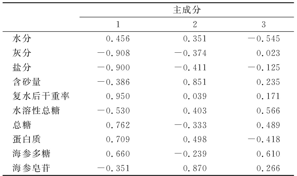 主成分123水分0.4560.351-0.545灰分-0.908-0.3740.023盐分-0.900-0.411-0.125含砂量-0.3860.8510.235复水后干重率0.9500.0390.171水溶性总糖-0.5300.4030.566总糖0.762-0.3330.489蛋白质0.7090.498-0.418海参多糖0.660-0.2390.610海参皂苷-0.3510.8700.266
