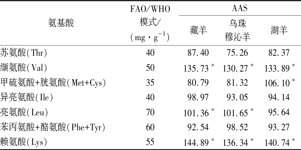 参照FAO/WHO必需氨基酸评分标准,由表4可知,藏羊肉、湖羊和乌珠穆沁羊肉中缬氨酸和赖氨酸的评分均高于FAO/WHO的推荐值,从氨基酸组成和含量评价,3种羊肉蛋白均属于优质蛋白质,有较高的营养价值,藏羊肉的营养价值可能要高于其他2种羊肉。