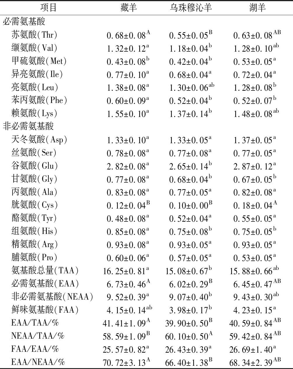 由表3可知,藏羊、乌珠穆沁羊和湖羊3种羊肉中均检测到17种氨基酸,其中人体必需的氨基酸有7种。3种羊肉中氨基酸总量(total amino acids,TAA)存在差异,其含量由大到小依次为藏羊>湖羊>乌珠穆沁羊,乌珠穆沁羊肉中TAA含量显著低于藏羊肉,这可能与其水分含量最高有关。藏羊肉、乌珠穆沁羊肉和湖羊肉中必需氨基酸(essential amino acid,EAA)含量分别为6.73%、6.02%和6.45%,藏羊肉中EAA的含量极显著高于乌珠穆沁羊肉(P<0.01)。氨基酸是蛋白质的重要组成部分,FAO/WHO推荐值EAA/TAA为40%左右及EAA/NEAA在60%以上为优质蛋白,在3种羊肉中检测到EAA/TAA为39.90%~41.41%,EAA/NEAA%为66.40%~70.72%,表明3种羊肉的蛋白质中必需氨基酸组成平衡,品质优良。