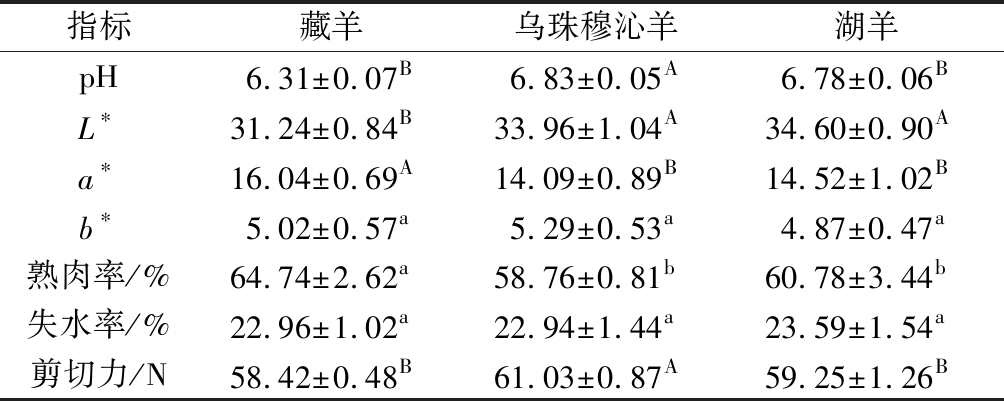 指标藏羊乌珠穆沁羊湖羊pH6.31±0.07B6.83±0.05A6.78±0.06BL∗31.24±0.84B33.96±1.04A34.60±0.90Aa∗16.04±0.69A14.09±0.89B14.52±1.02Bb∗5.02±0.57a5.29±0.53a4.87±0.47a熟肉率/%64.74±2.62a58.76±0.81b60.78±3.44b失水率/%22.96±1.02a22.94±1.44a23.59±1.54a剪切力/N58.42±0.48B61.03±0.87A59.25±1.26B