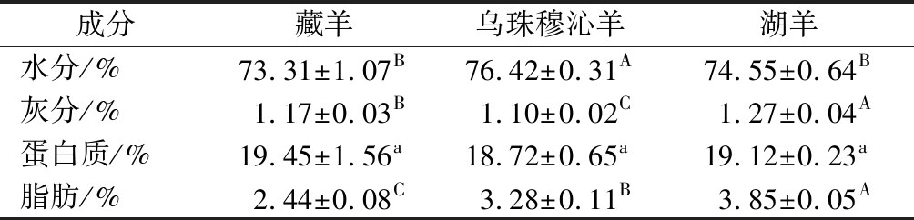 成分藏羊乌珠穆沁羊湖羊水分/%73.31±1.07B76.42±0.31A74.55±0.64B灰分/%1.17±0.03B1.10±0.02C1.27±0.04A蛋白质/%19.45±1.56a18.72±0.65a19.12±0.23a脂肪/%2.44±0.08C3.28±0.11B3.85±0.05A